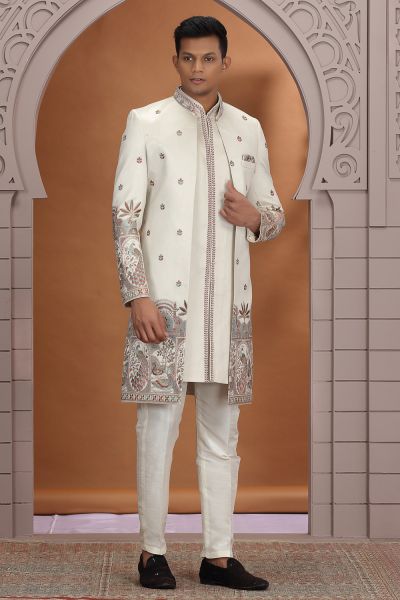 Beige Art Silk 3 piece Indo Western is designed with embroidery work. Comes with a bottom. Actual product colors, patterns and designs may slightly vary.