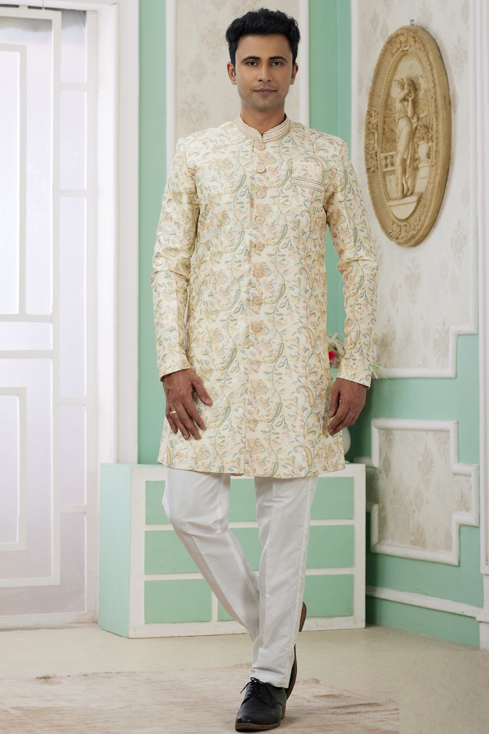 Yellow Banarasi Jaquard Indo Western is designed with embroidery work. Comes with a bottom. Actual product colors, patterns and designs may slightly vary.