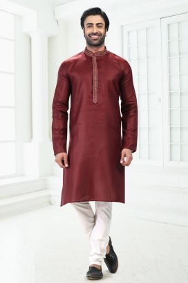 Try out the classic knee-length coffee brown kurta featuring pintux work for a timeless look. You can also opt for a short kurta for a more casual and contemporary vibe.