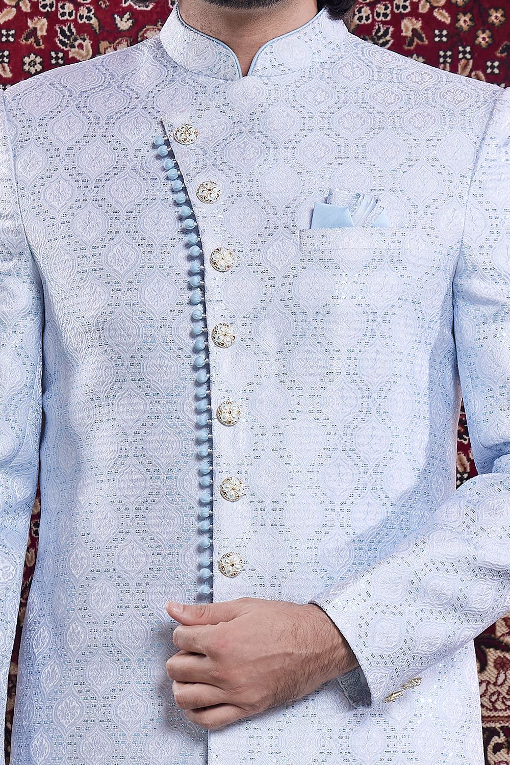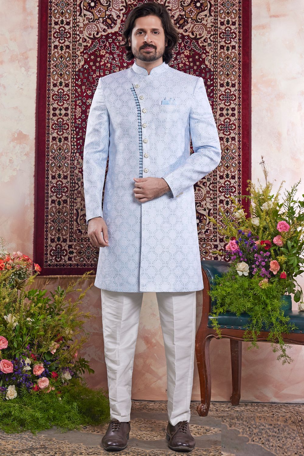 Blue Mens Banarasi Jaquard Indo Western (NMK-8563)