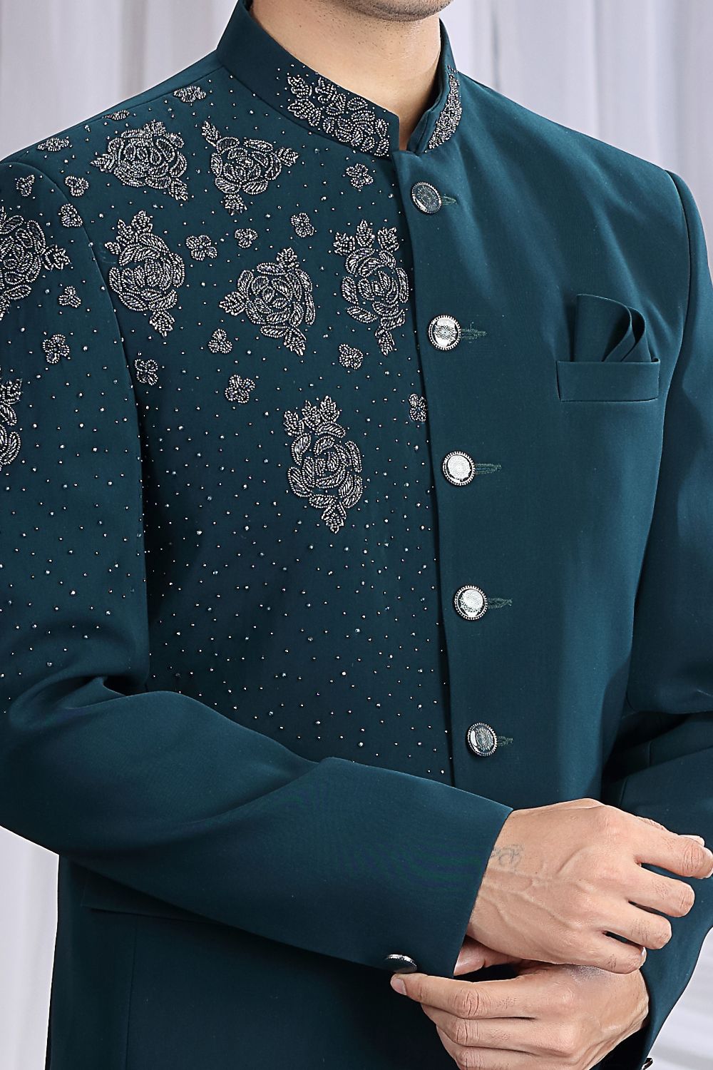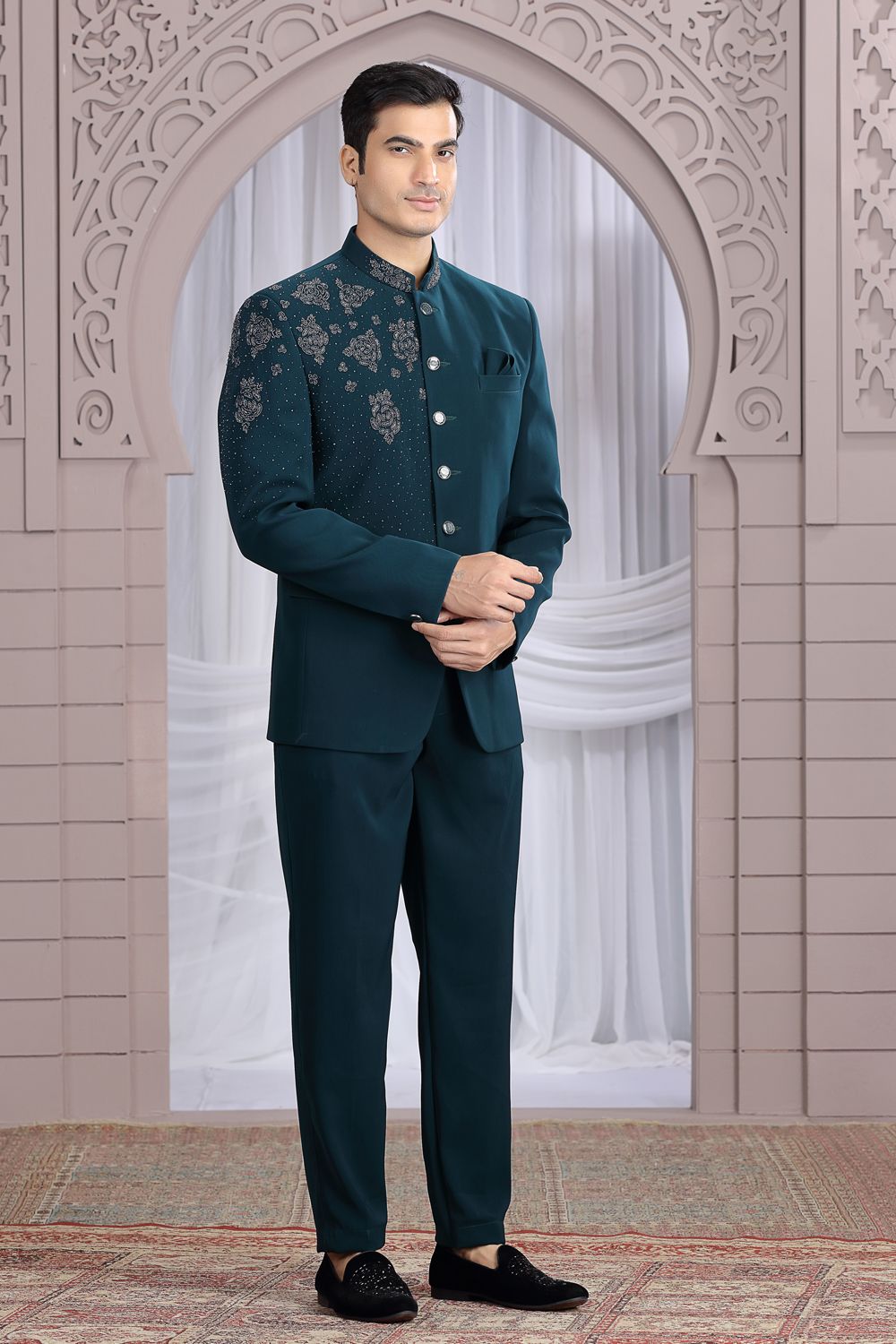 Dark Green Imported Jodhpuri is designed with hand work embroidery. Comes with a bottom. Actual product colors, patterns and designs may slightly vary.