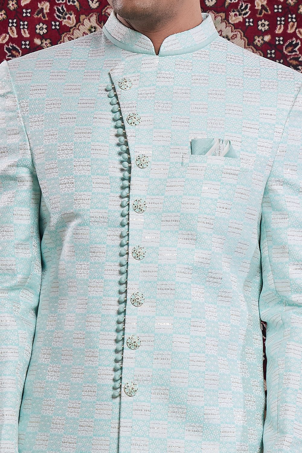Green Banarasi Jaquard Indo Western is designed with buttons and patti work. Comes with a bottom. Actual product colors, patterns and designs may slightly vary.