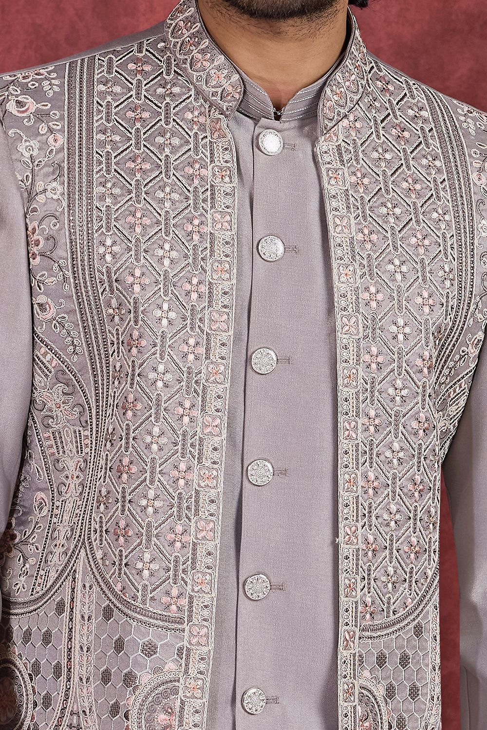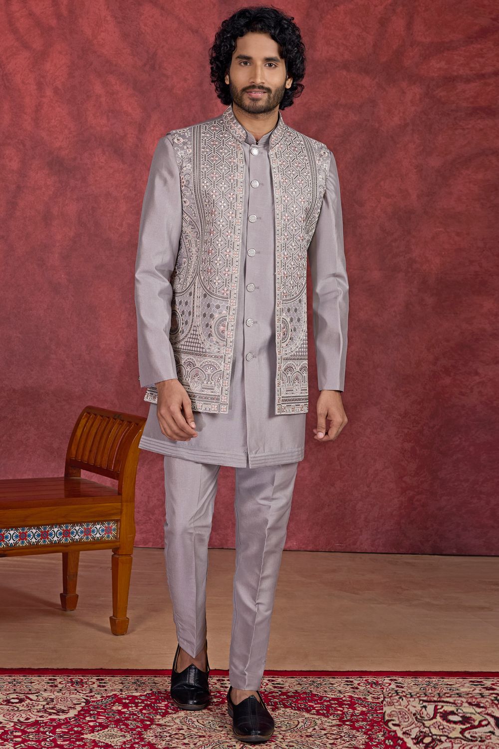 Grey Silk 3 piece Long Jacket Indo Western (NMK-8691)