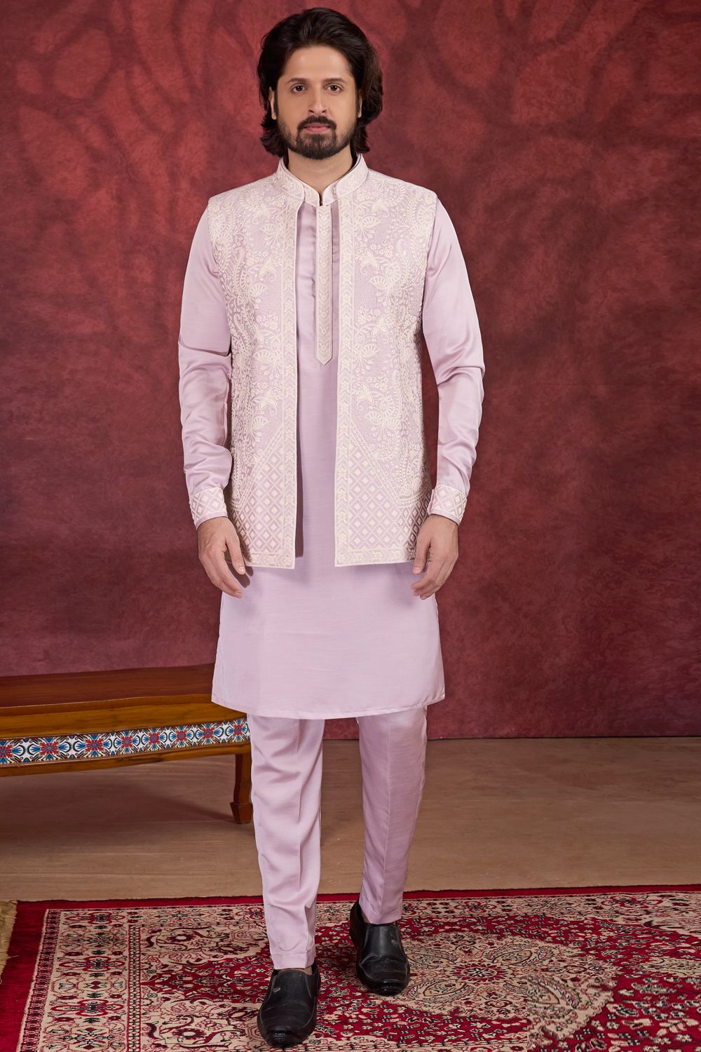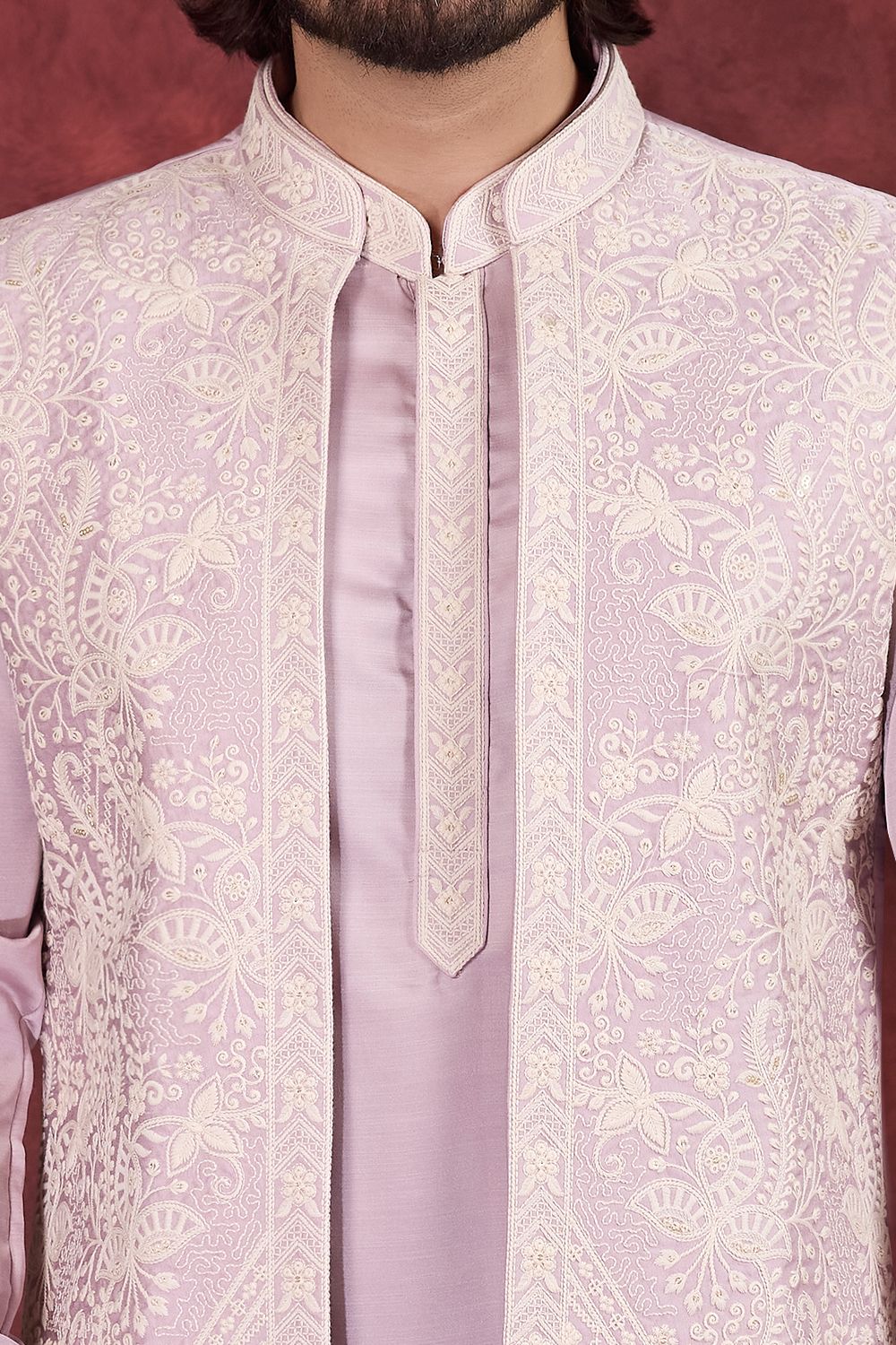 Lavender Art Banarasi Silk 3 piece Long Kurta Jacket is designed with thread embroidery work. Comes with a bottom. Actual product colors, patterns and designs may slightly vary.