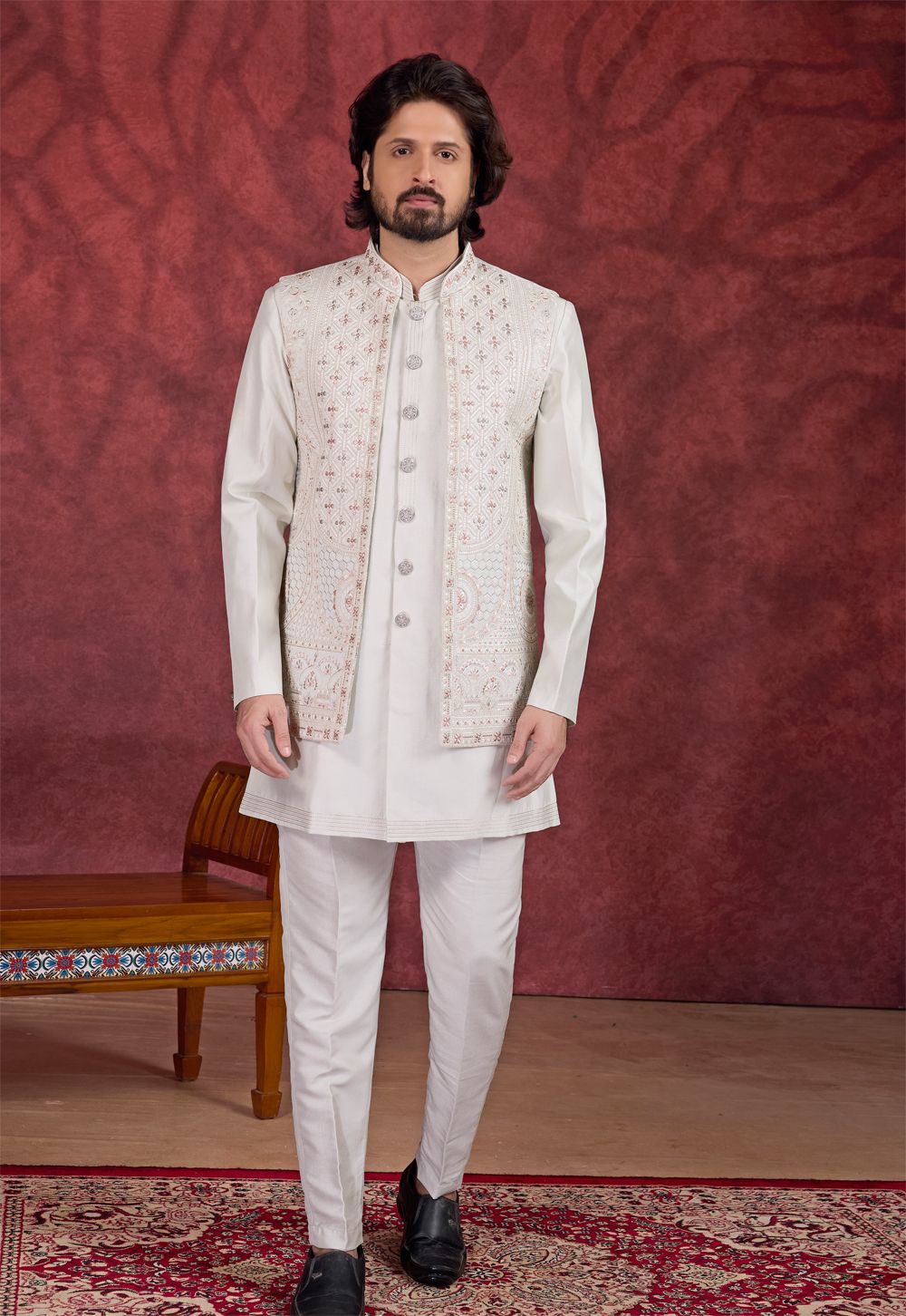 Light Pista Green Art Banarasi Silk 3 piece Long Jacket Indo Western is designed with thread embroidery work. Comes with a bottom. Actual product colors, patterns and designs may slightly vary.