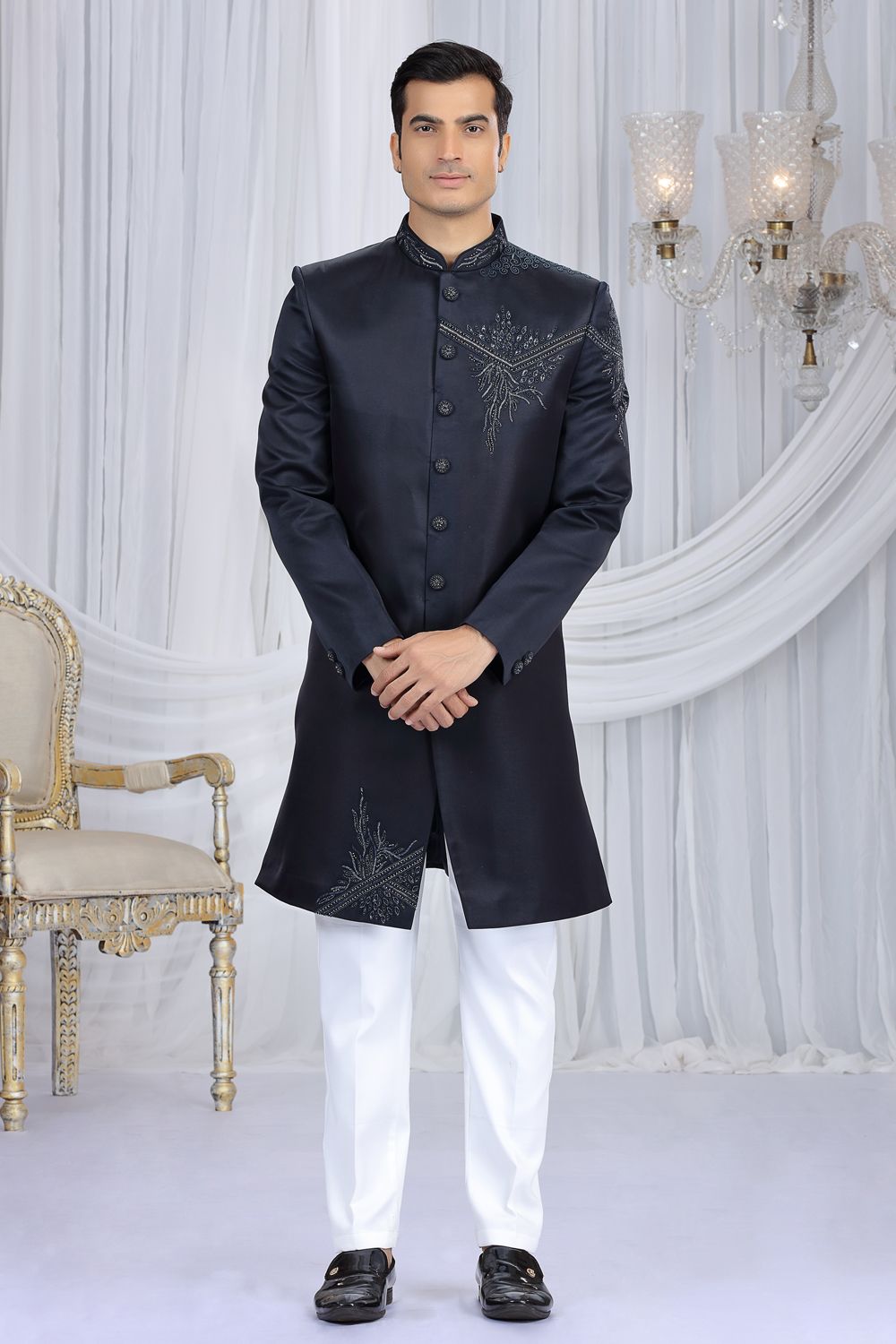Navy Blue Art Silk Indo Western is designed with embroidery work. Comes with a bottom. Actual product colors, patterns and designs may slightly vary.