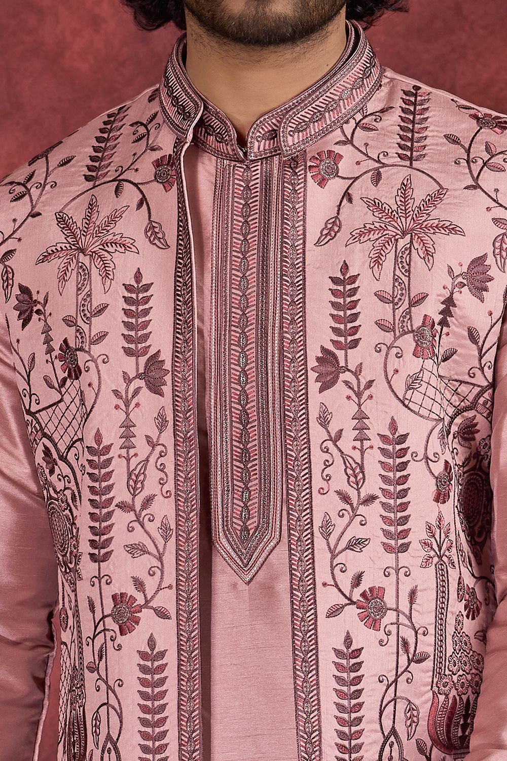 Pink Art Banarasi Silk 3 piece Long Kurta Jacket is designed with thread embroidery work. Comes with a bottom. Actual product colors, patterns and designs may slightly vary.