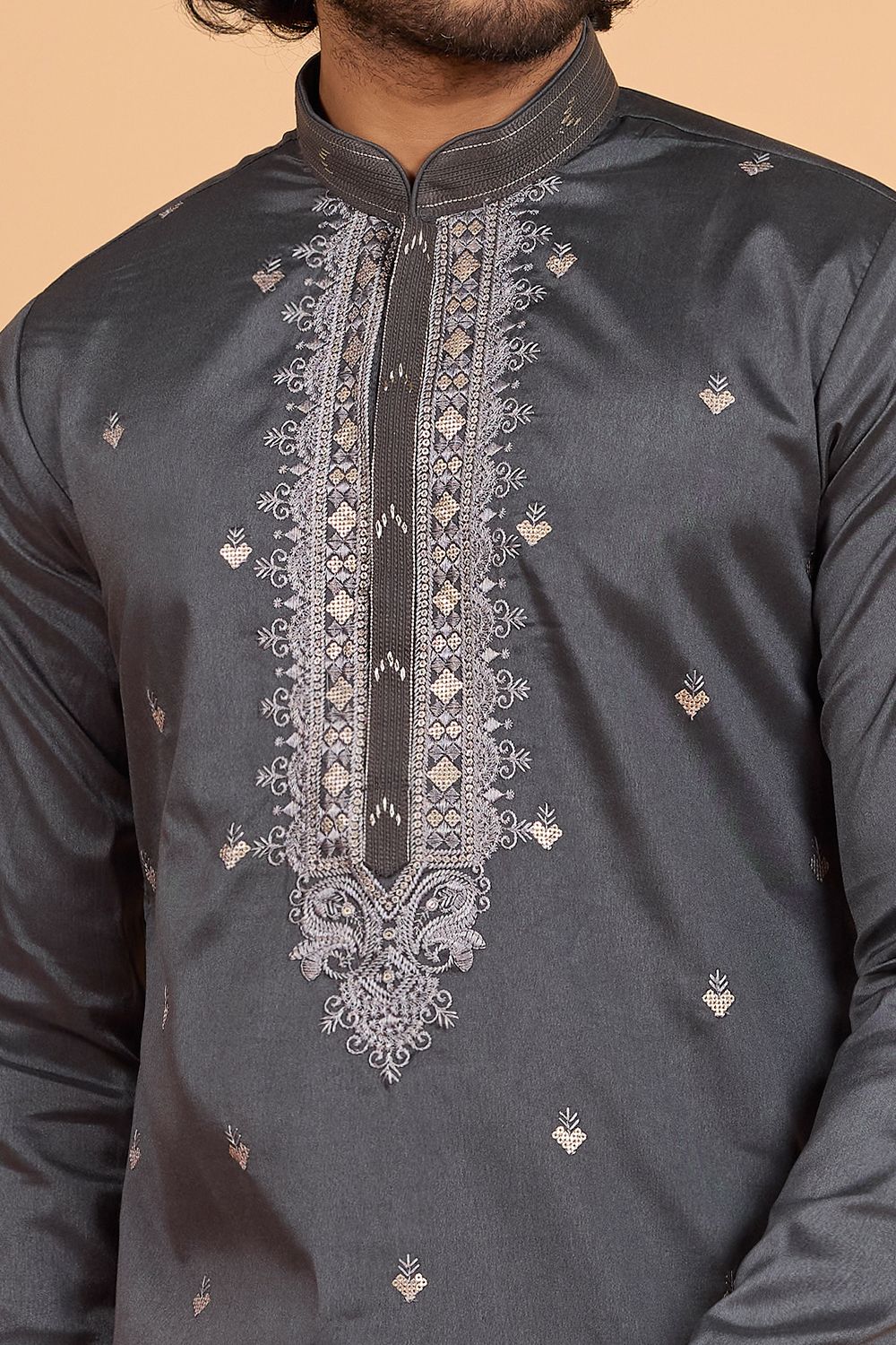 Description | Dark Grey Art Banarasi Silk Kurta Pajama is designed with embroidery work. Comes with a bottom. Actual product colors, patterns and designs may slightly vary. |