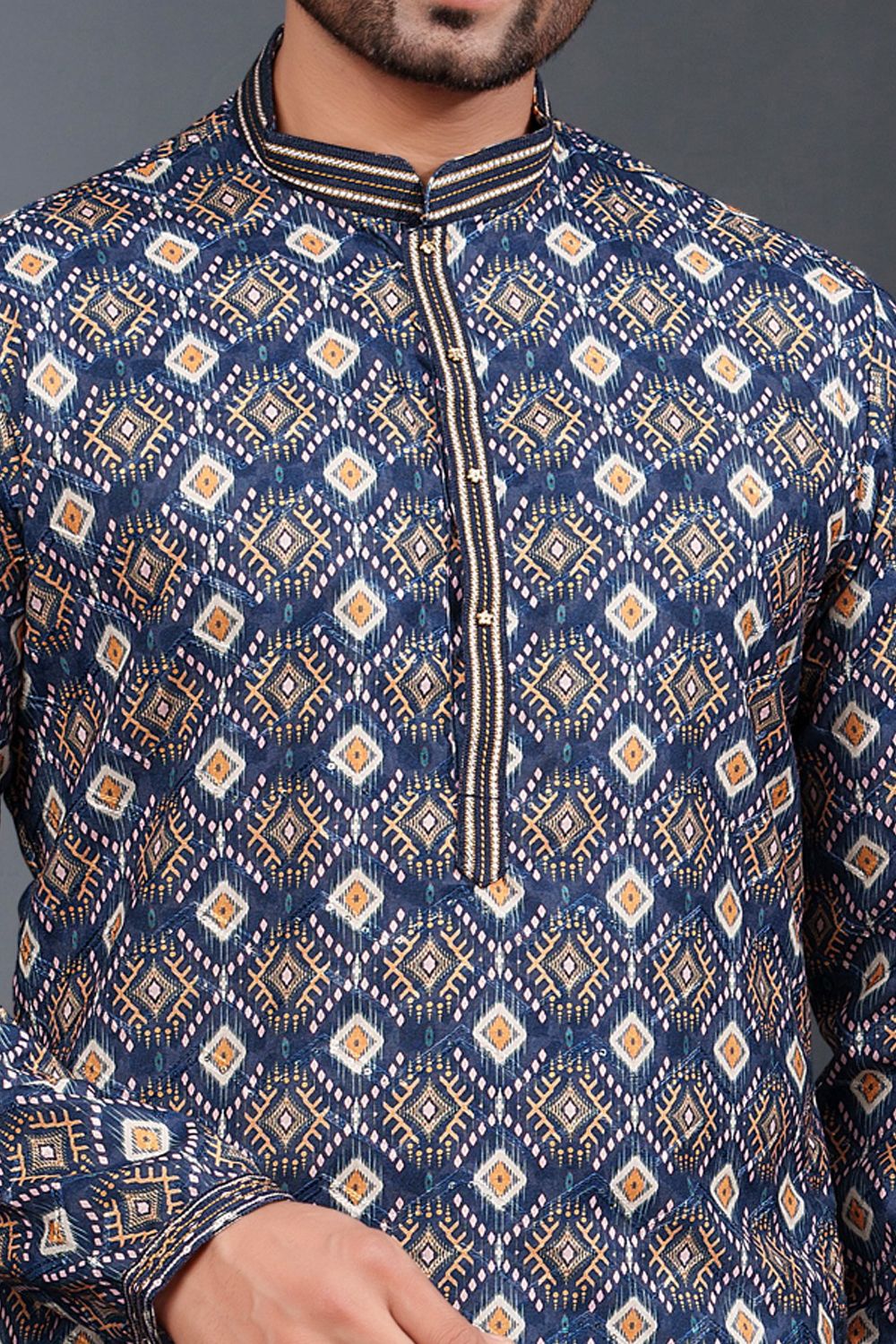 Description | Navy Blue Printed Cotton Silk Kurta Pajama is designed with lace work. Comes with a bottom. Actual product colors, patterns and designs may slightly vary. |