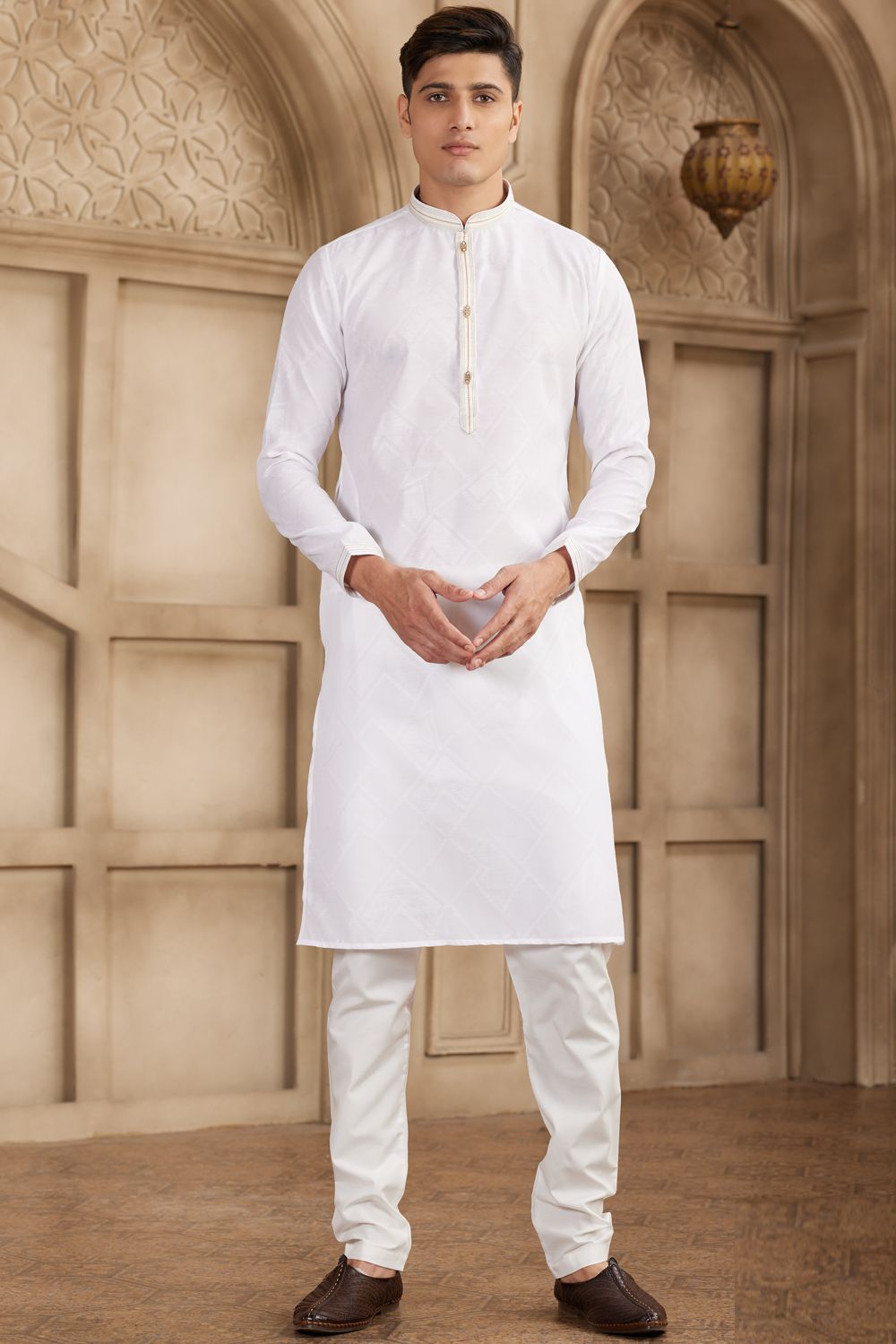 Description | Off White Art Silk Kurta Pajama is designed with self brocade and pintux work. Comes with a bottom. Actual product colors, patterns and designs may slightly vary. |