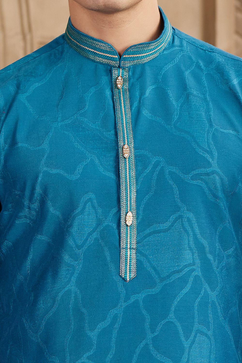 Description | Teal Blue Art Silk Kurta Pajama is designed with self brocade and pintux work. Comes with a bottom. Actual product colors, patterns and designs may slightly vary. |