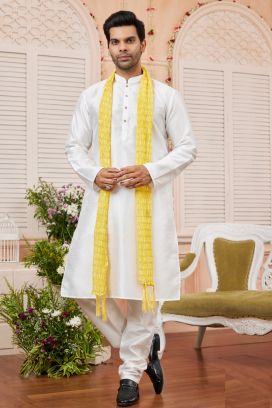 Become the source of light at any puja or festival you attend, adorned in vibrant hues and striking embellishments. Especially, opt for our festive kurta pajama picks, like the Yellow Banarasi Art Silk Kurta Pajama, stitched to precise and sleek perfection. It shall be the perfect match to the vigor and joy of any celebration you grace with your presence.
