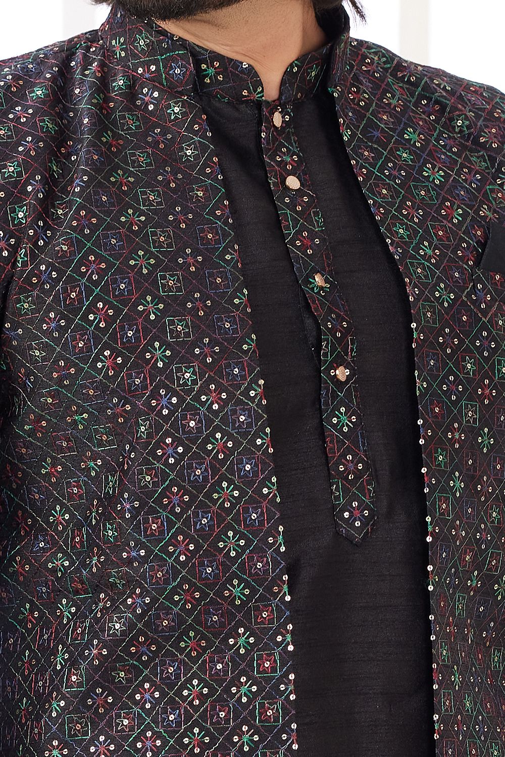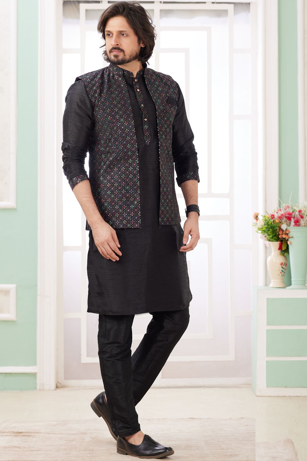 Description | Black Art Banarasi Silk Jacket Style Kurta is designed with computer thread work jacket. Comes with a bottom. Actual product colors, patterns and designs may slightly vary. |