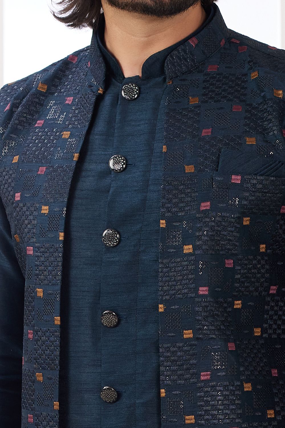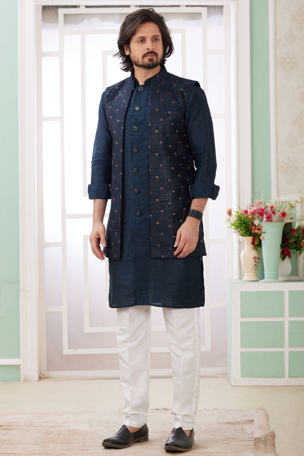 Description | Blue Art Banarasi Silk Jacket Style Kurta is designed with computer thread work jacket. Comes with a bottom. Actual product colors, patterns and designs may slightly vary. |
