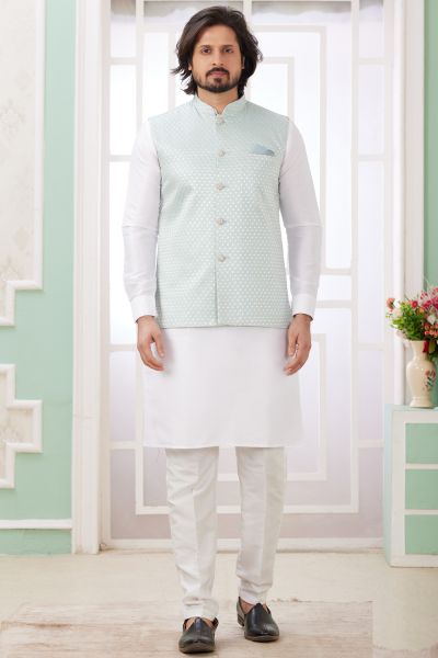 Description | Off White Art Banarasi Silk Jacket Style Kurta is designed with computer thread work jacket. Comes with a bottom. Actual product colors, patterns and designs may slightly vary. |