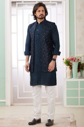 - Mix & Pair with Different Textures: Style your jacquard and art dupion Nehru jacket with contrasting textures. Experiment away with faux leather or even denim picks for added visual depth.