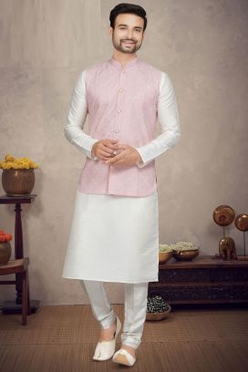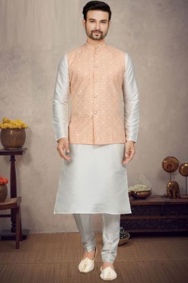 So, grace your social circles and themed parties in a stylish Nehru jacket. Especially, you can opt for our Peach Pink Silk Printed Nehru Jacket to immediately elevate your aura!