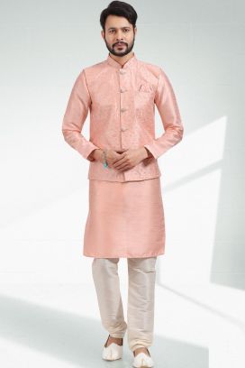 So, grace your social circles and themed parties in a stylish Nehru jacket. Especially, you can opt for our Peach Pink Silk Printed Nehru Jacket to immediately elevate your aura!
