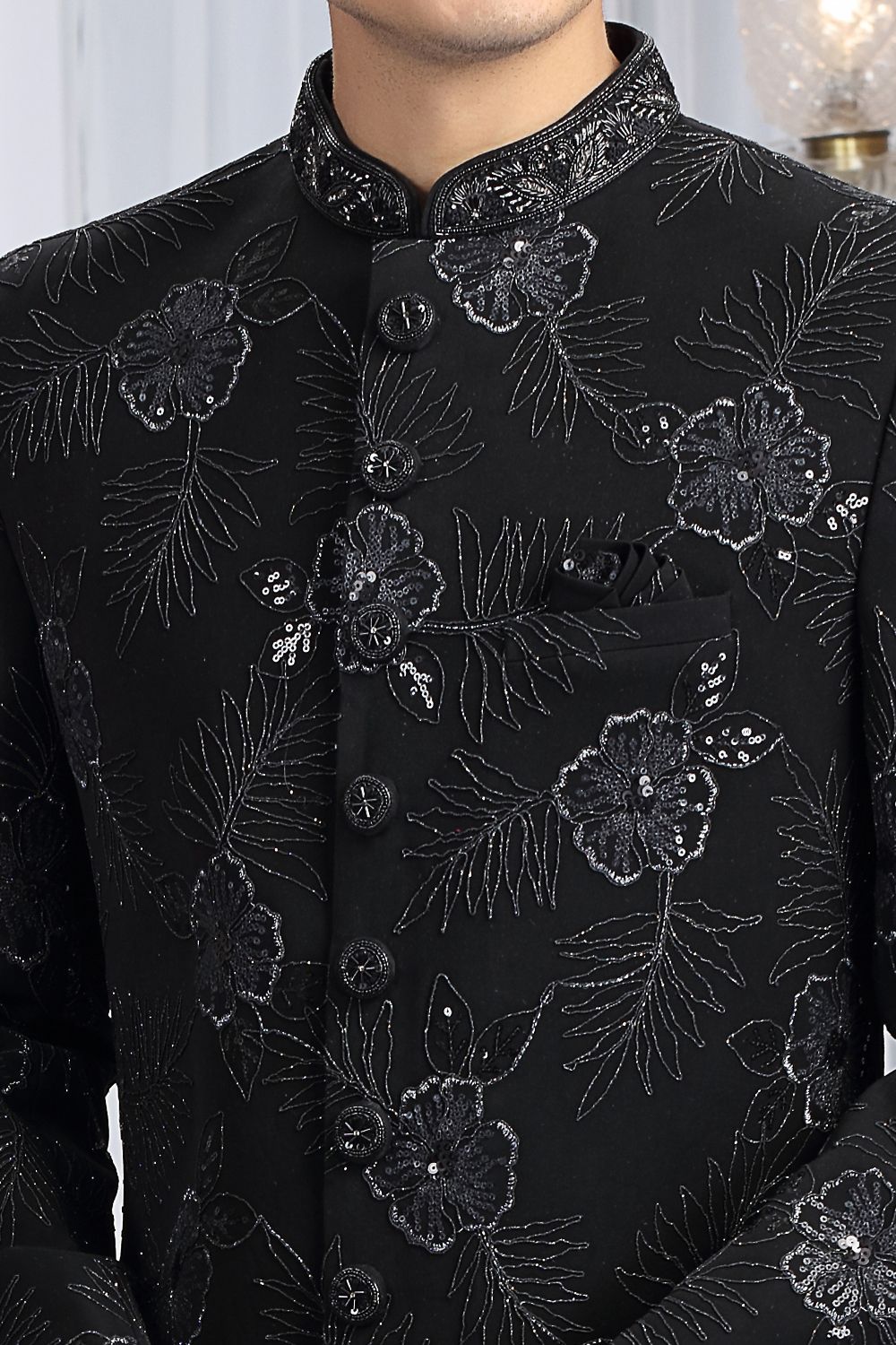 Black Art Silk Sherwani is designed with sequins, thread, beads and stone embroidery work. Comes with a bottom. Actual product colors, patterns and designs may slightly vary.