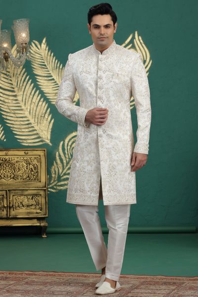 Cream Art Silk Sherwani is designed with all over sequins and computer thread work. Comes with a bottom. Actual product colors, patterns and designs may slightly vary.