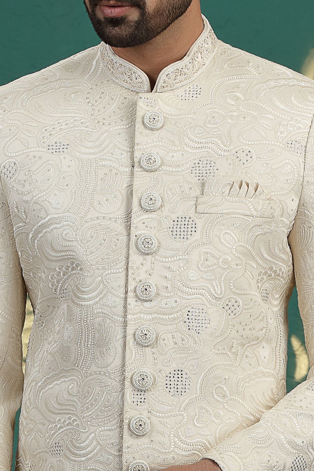 Cream Art Silk Sherwani is designed with all over hand embroidery and computer thread work. Comes with a bottom. Actual product colors, patterns and designs may slightly vary.