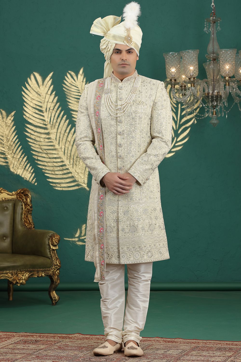 Cream Art Silk Wedding Sherwani (NMK-8596)