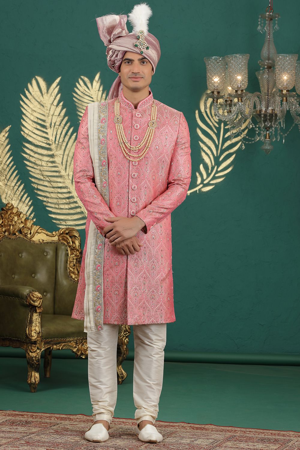 Pink Banarasi Jaquard Sherwani is designed with all over hand embroidery work. Comes with a bottom. Actual product colors, patterns and designs may slightly vary.