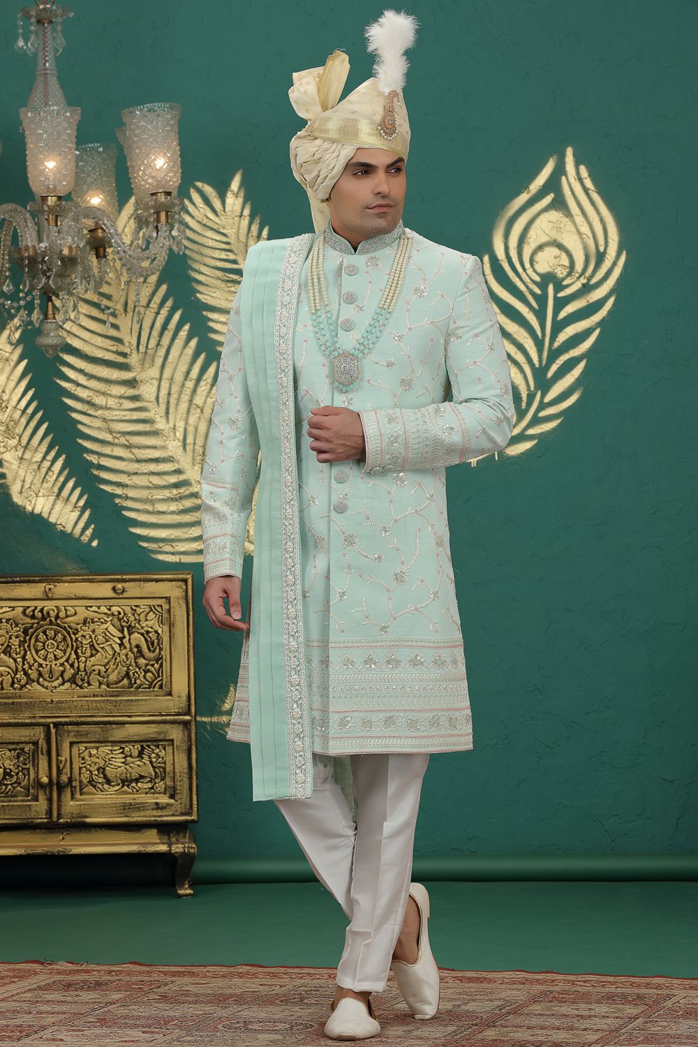 Pista Green Art Silk Sherwani is designed with all over hand embroidery and computer thread work. Comes with a bottom. Actual product colors, patterns and designs may slightly vary.