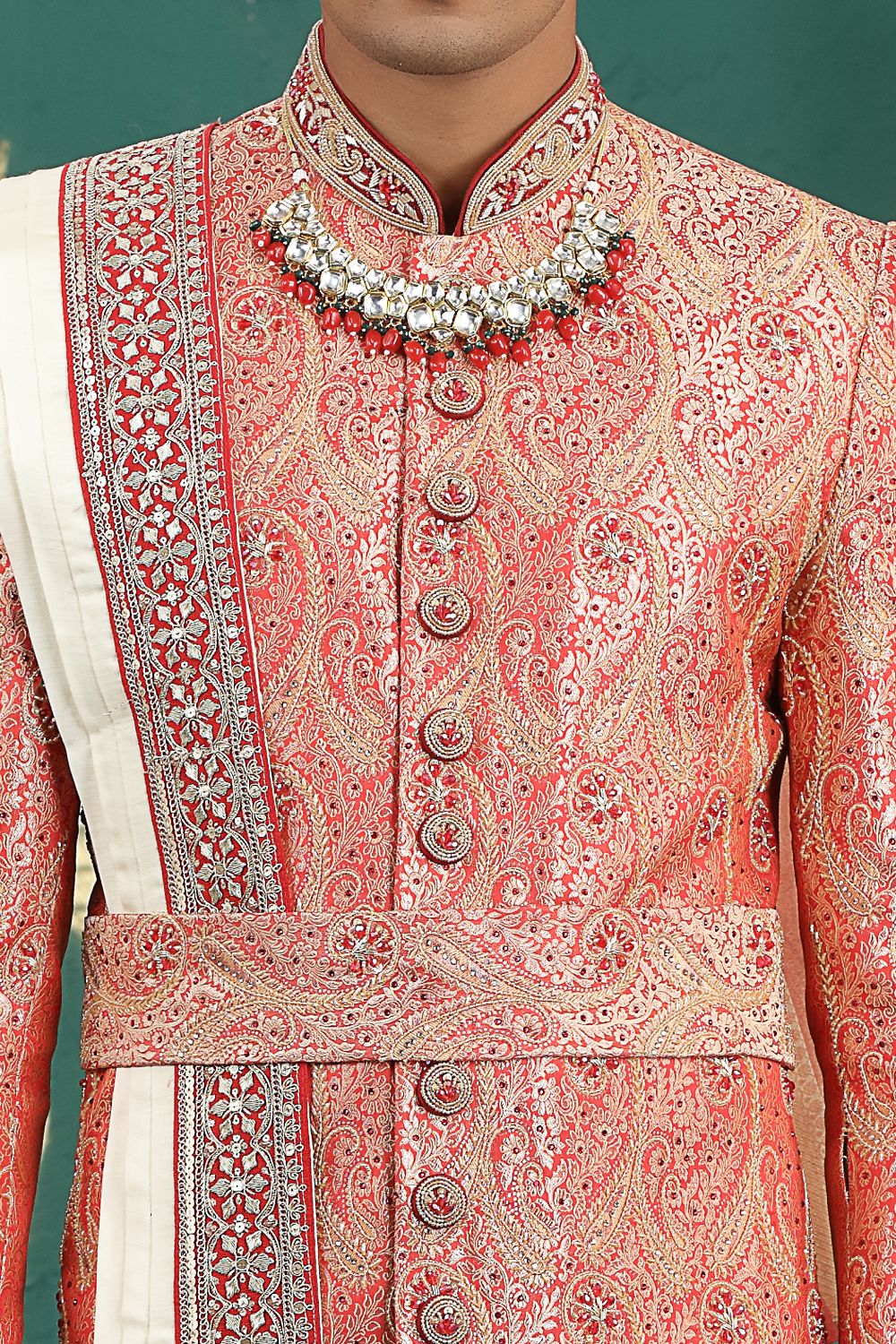 Red Banarasi Jaquard Wedding Sherwani (NMK-8611)