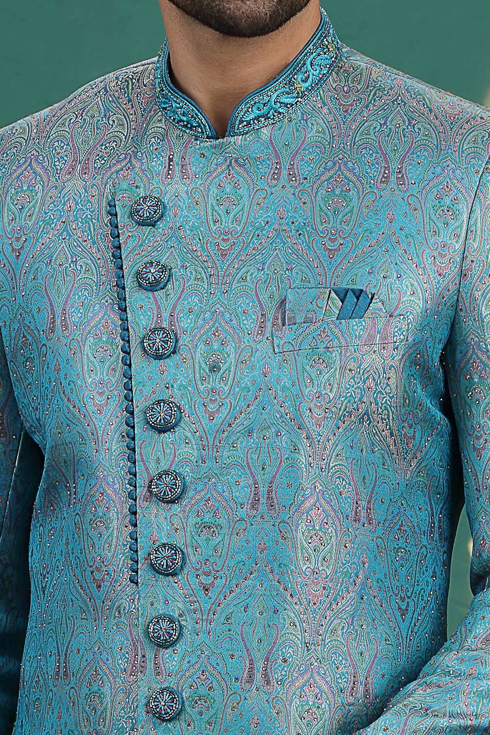 Teal Blue Banarasi Jaquard Sherwani is designed with all over hand embroidery work. Comes with a bottom. Actual product colors, patterns and designs may slightly vary.