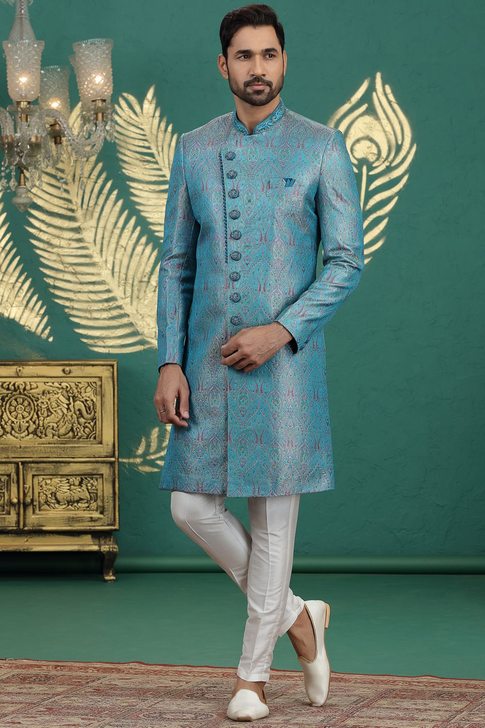 Teal Blue Banarasi Jaquard Sherwani (NMK-8614)