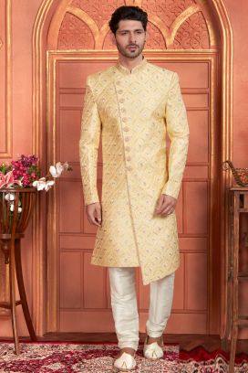 Plus, we make sure to incorporate modern elements of design. Take our Cream Art Silk Wedding Sherwani for instance, it shall make you feel like absolute royalty!